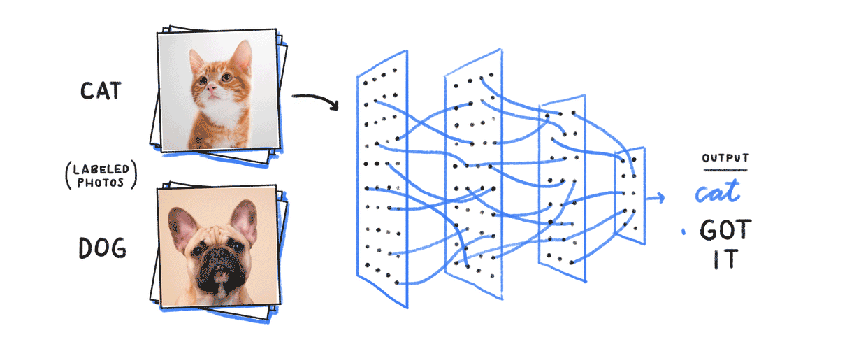 We know that this is the mechanism in our brains and we can tell the difference between images of dogs and cats, so in theory there must be a man-made neural network we can implement on a computer that will do the same thing. Of course, there nearly 100 billion neurons in a human brain and we don't know how they are interconnected. The plan for AI was to create a multi-level network of neurons, and increase the number of levels and number of neurons on each level until some useful result emerged. Of course, we don't know the weights and we don't want to figure them out "by hand". We want the determination of the weights to be done by the computer. This is the machine learning part.