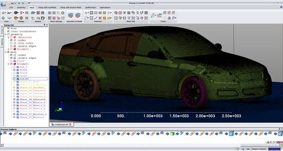 On inspection there is a double face where the mirrors attach to the car. Like the exhaust, had we removed these surfaces before the merge they would have been treated correctly by the automatic routines. Sometimes it is easier to simply help the automatic repair ahead of time. Or just delete the surfaces.