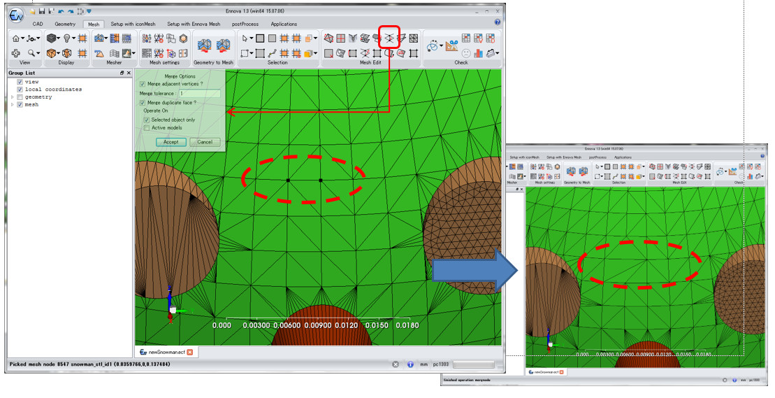 Use this command to merge nodes. Either the edge or the two end point nodes of the edge maybe selected. The second node is replaced with the first node. The merge options allows the input of a merge tolerance