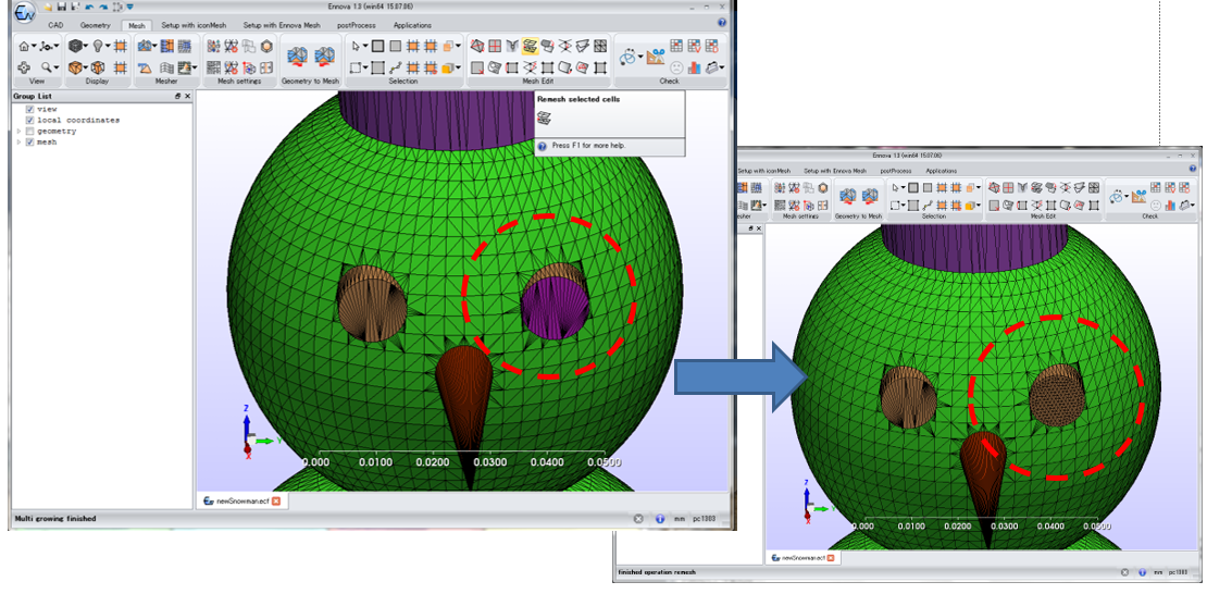 Here the snowman's left eye has been remeshed