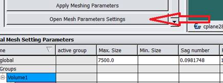 But use the View Meshing Parameter Window to gain access to the Group level. The Window has both Global and Local Settings. Notice there are two methods to enter Mesh Parameter settings. The first is a drop down dialog box and the other is a spreadsheet accessed from the “Open Mesh Parameter Settings Button” in the local Mesh Setting Dialog box. Both methods point to the same data and may be used at your convenience. Please note that for the Dialog box entry (not the spreadsheet) you must “Apply” your changes for the database to be updated.