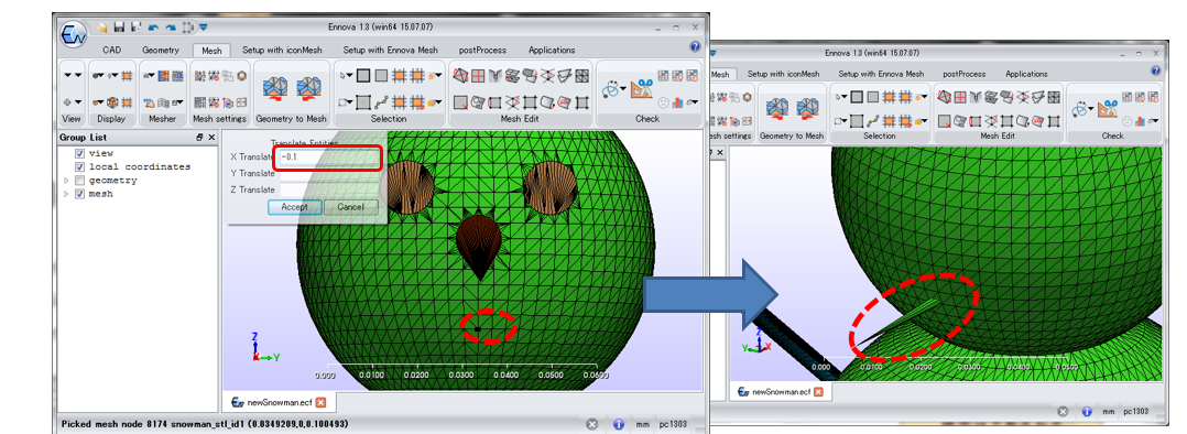 Select a single node to transform. Enter the cartesian displacement the table to transform the node.